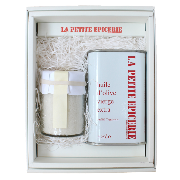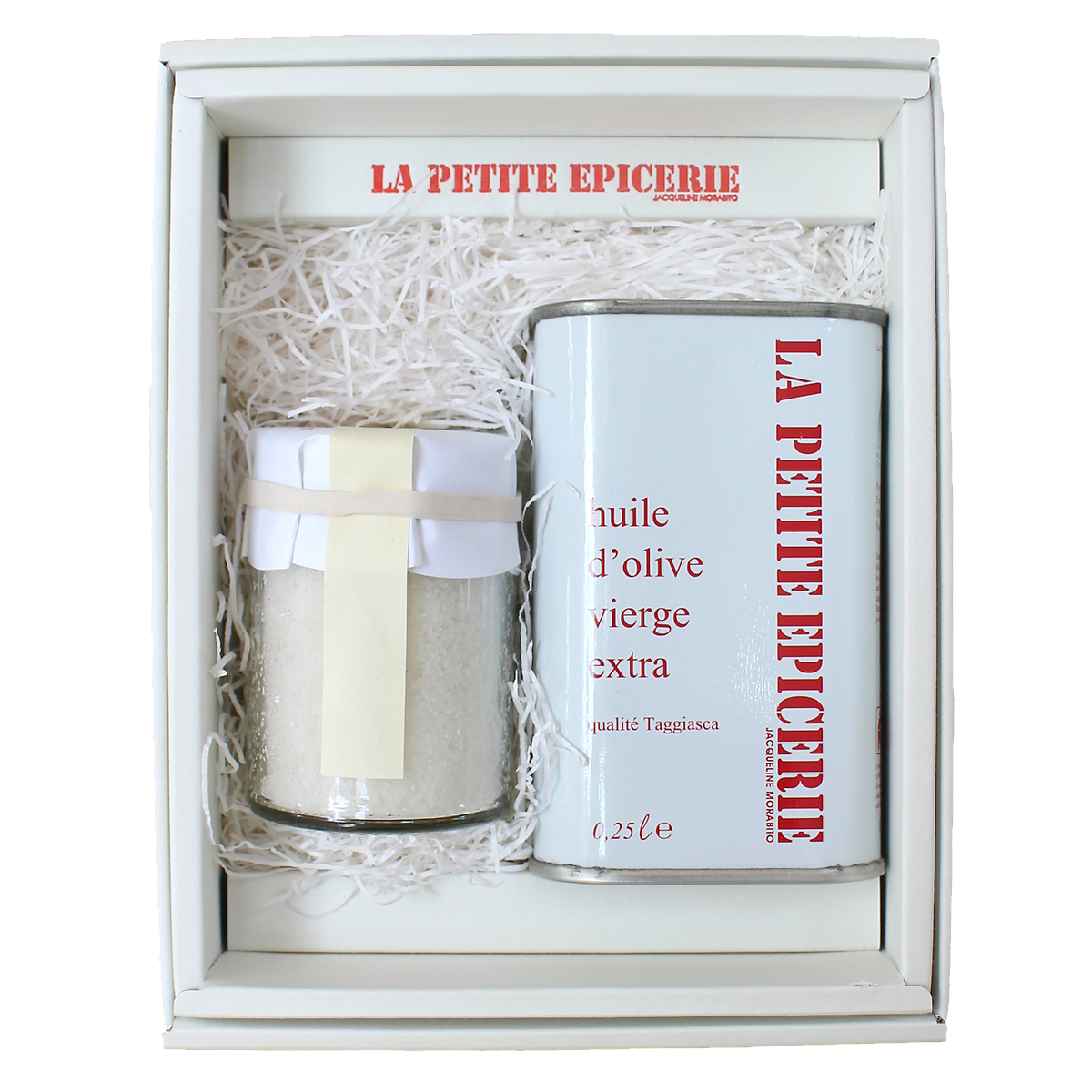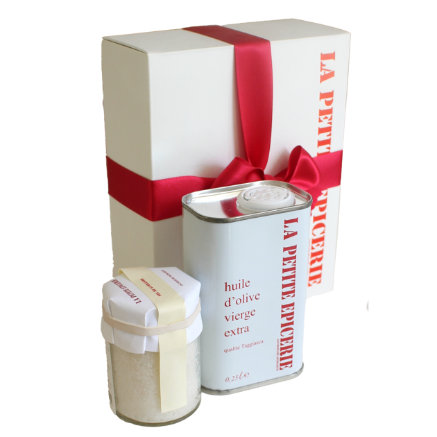 商品内容:エクストラバージンオリーブオイル タジャスカ 250ml、ソルト ゲランド100g、ギフトボックス C式S、レシピ付き