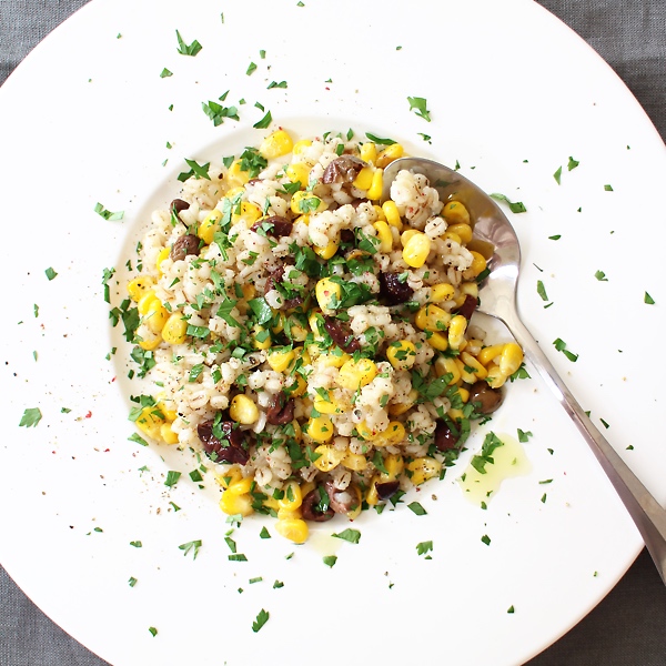 生のとうもろこしをオリーブオイルで炒め、ぷっくりしたら、押麦を加えさらに炒める。