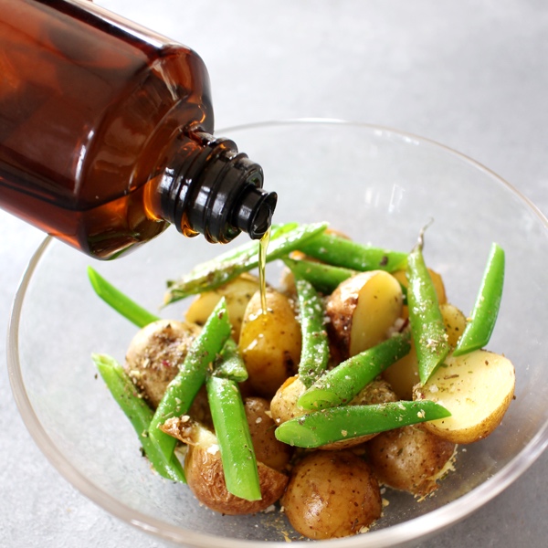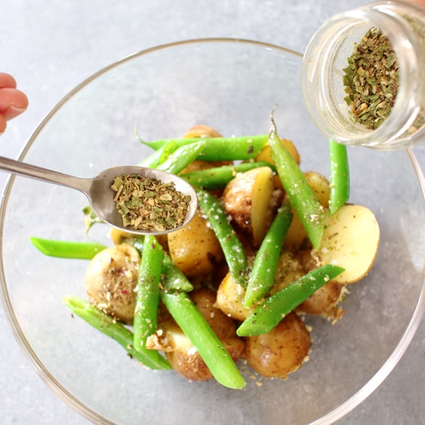 手順2のじゃがいもを半分、インゲンを3等分に切り、ボウルに入れ、スパイス アンティーブ、ソルト ゲランドをふる。