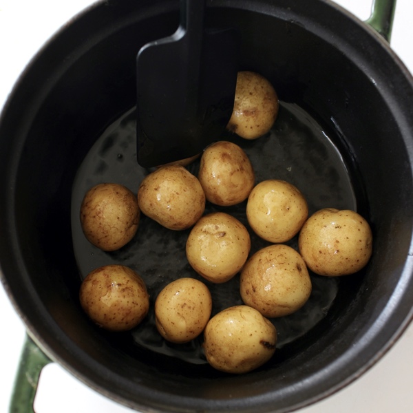 厚手のお鍋に1cm程オリーブオイル(分量外)を入れて、ジャガイモを軽く炒める。
