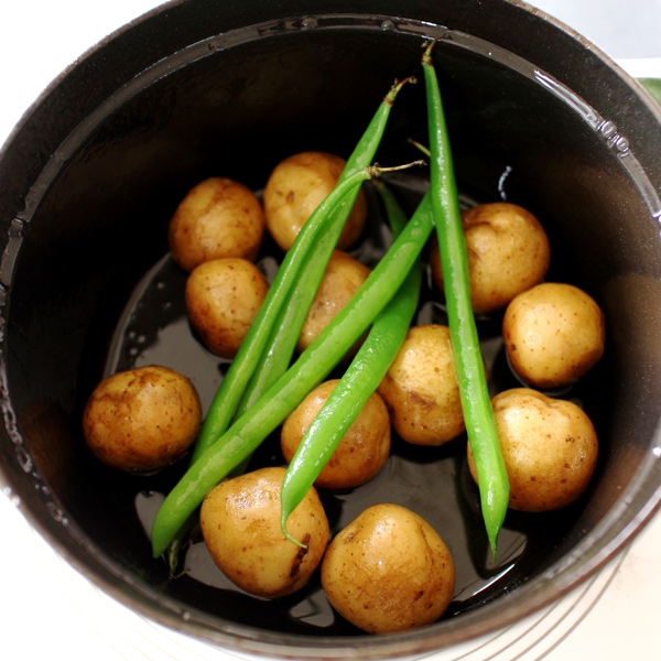 じゃがいもが柔らかくなったらインゲンも入れて、2~3分程揚げ煮にする。